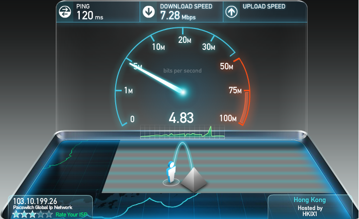 Exp加速器 在我们测试的大多数国家/地区都表现得异常稳定,这意味着您不需要为了隐私而牺牲视频和音频流媒体性能,在选择香港的服务器环境下,10M的电信宽带,测试结果还是可以的,下载速度达到了7.28M,基本没什么网速损失。